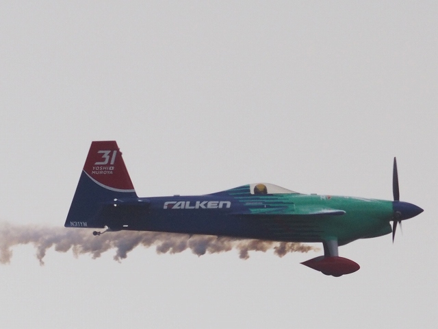 そして「ファイナル4」が始まります。トップバッターは室屋義秀選手です。一昨年前はグレーの期待でしたが今年はグリーンなんですね。ばっちり室屋選手のヘルメットも映ってます。