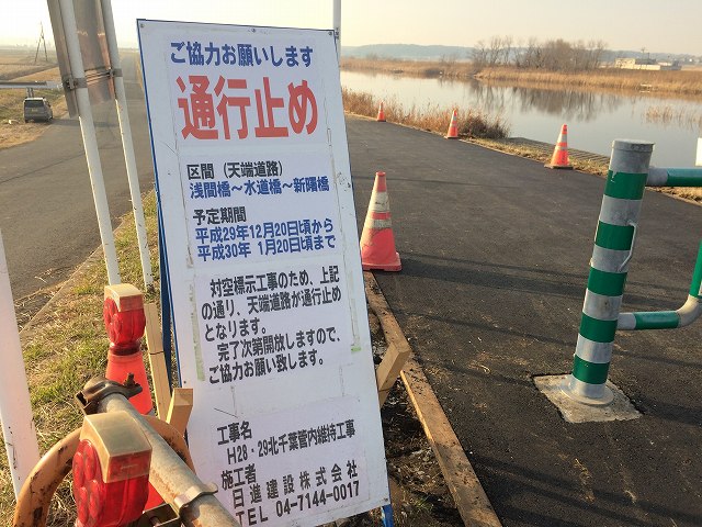 気を取り直して、手賀川沿いに走りますが、なんと通行止めでした。最近話題の対空表示工事と記載されているので、右岸側も舗装して空から手賀川ってわかる表示をするのでしょう。