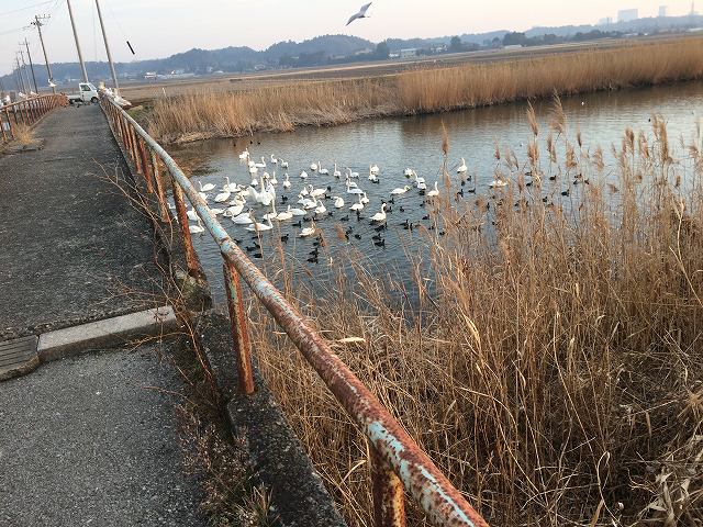 久しぶりに発作橋まで行ってみましたが、古い橋には鎖までできていました。もう危ないくらい老朽化しているのでしょうね。でも、いつものおじさんが餌をあげると白鳥とオオバンがいっぱい!でも橋の上にはウミネコがいっぱいいました。
