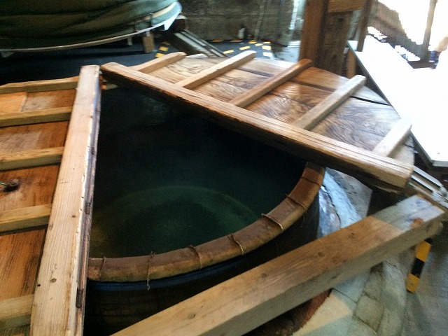 田中酒造さんはご夫婦で運営も酒造りもされているのでイベントの日はお店も酒蔵も稼動していませんので、見学用にお米を蒸すための釜にお湯をはって見せてくれました。温度は40度くらいでちょうどいい湯加減との事、、、大き目の五右衛門風呂ですね(笑)