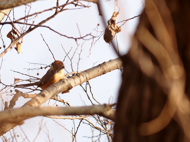 手賀沼に到着すると、モズが珍しく毛づくろいをしているのを発見しました。撮ってみると「なんか目つき悪い」