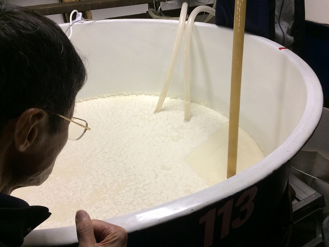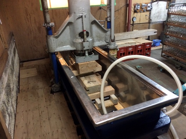 これは十分発酵したお酒を絞るところなのですが、田中酒造さんではこんな感じで上から圧力を掛けて絞るそうです。少し古い機械らしく効率はよくないといわれてましたが、絞り加減が酒蔵毎にばらばらで酒蔵毎の味がでるそうです。簡単に説明してくれましたが、最後まで絞らないのでお酒の味もよく、酒糟にお酒が残っているので、酒糟目当てのお客さんも多いそうです。