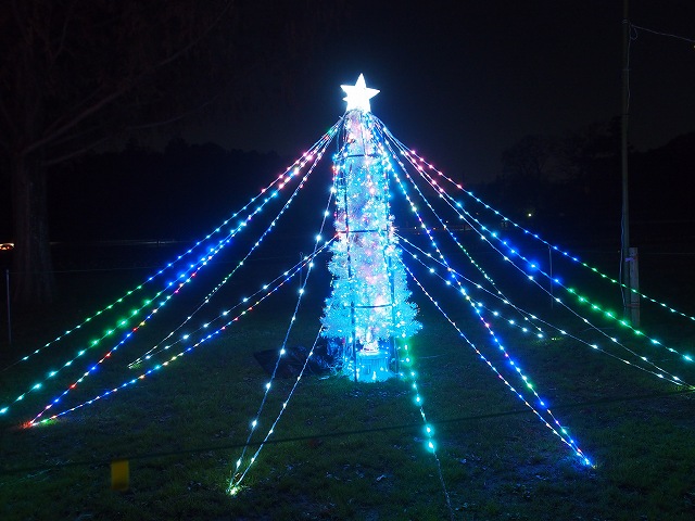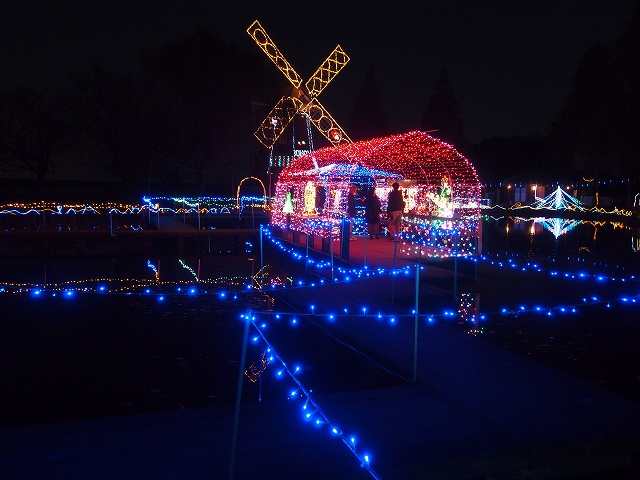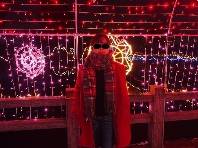なんとか駐車して、これまた真っ暗な道を歩いてアプローチします。駐車場あたりからでもキラキラとイルミネーションが見えていたのですが、近づくとそれなりに人が居ます。池の上の道もライトアップされていますが、落ちそうで怖い(笑)