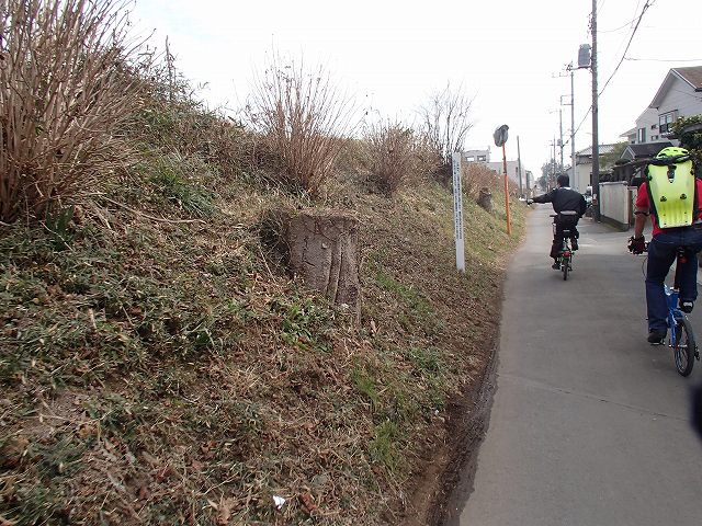 ここだけは止まって見学しました。この道は比較的最近できた「我孫子までのバイパス」なのですが、野馬土手を突っ切って道路ができたそうで、野馬土手の断面が道路わきに見えてます。
