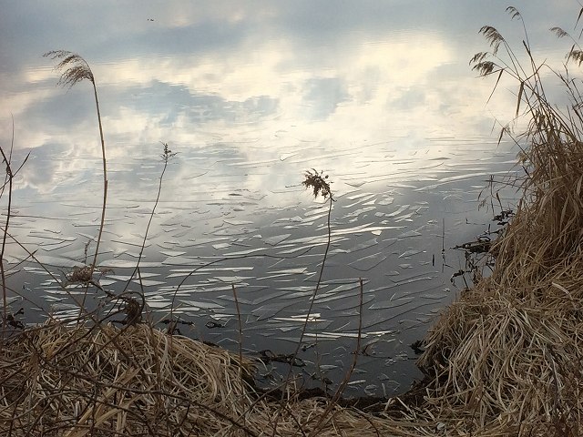 手賀沼が凍ってます。静かな湖面と氷と湖面に映った空がきれいです。