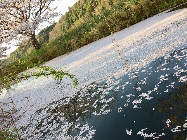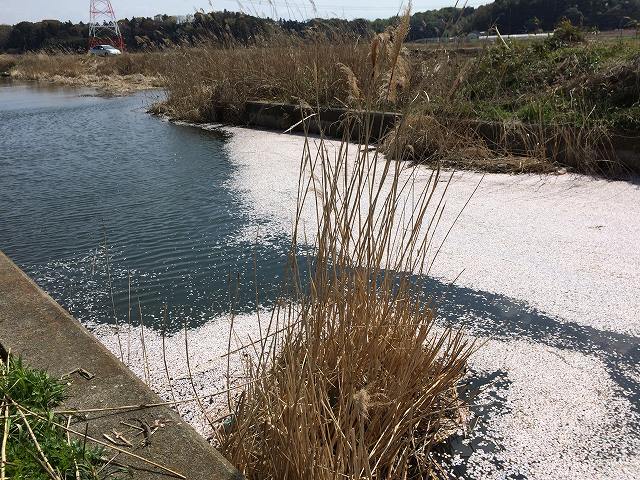 昨日の昼間に少し花絨毯になりかけていたものが、河口に集まっていたみたいですね。今日はカヌーでお花見している人が居たのでカヌーが通った跡が残ってますが、すぐに無くなりました。昨日から一日たった花びらでしたが、久しぶりに花絨毯をみることができました!やっぱりこれですね!