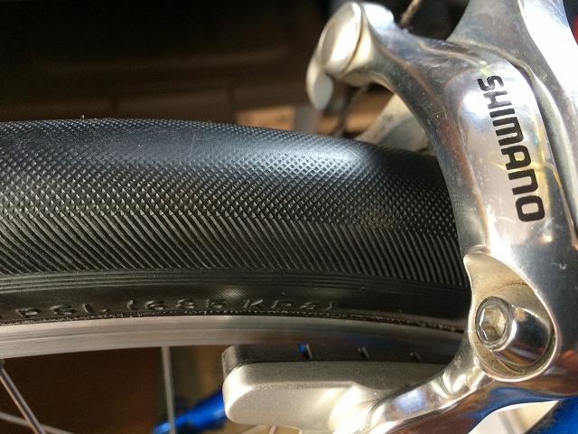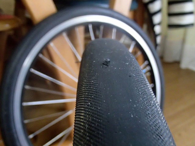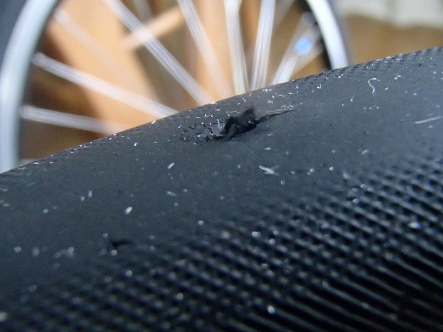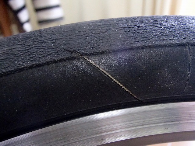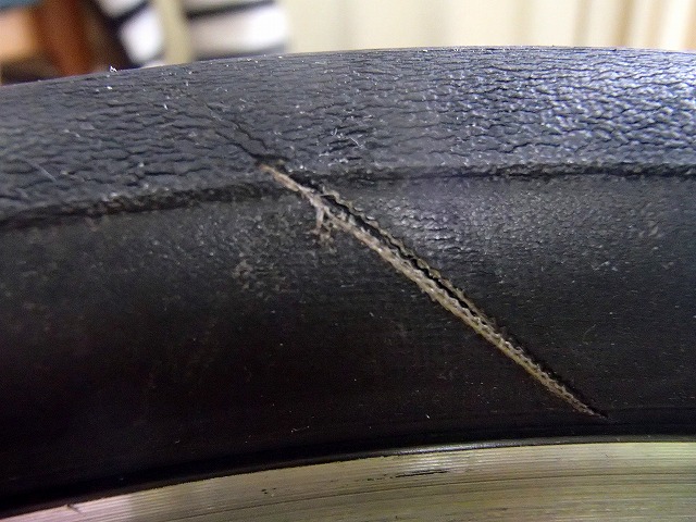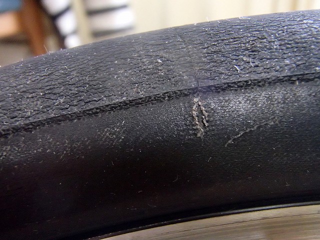 前輪はパナレーサーのタイヤなのですが、気になる裂け目があるます。これは新品でもあるみたいなのですが、こっちはありえないところに裂け目があるので、アブないですね。