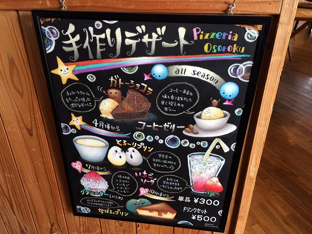 11:30頃に到着しましたが、以前はなかったカッコイイ看板がありました。最初の画像がお食事メニュー、上の画像がデザートですね。まだ、混む前だっのでテラス席に案内してもらって、いっぱいあるメニューからかなり悩んでから注文したのは。