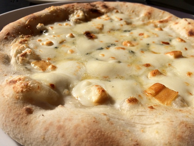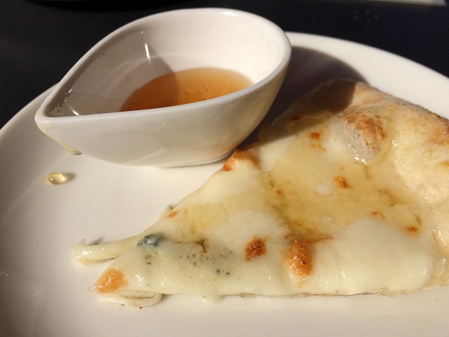 四種チーズのピザ(はちみつ付き)は、ブルーチーズの酸味がめちゃくちゃ美味しい!はちみつを耳の部分に掛けるとスイーツになってこれまた美味しいです。