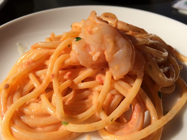 海老のとトマトクリームソースパスタは、プリップリの半生海老がいっぱい!太めのパスタはソースが絡んでこれまためちゃくちゃ美味しい!