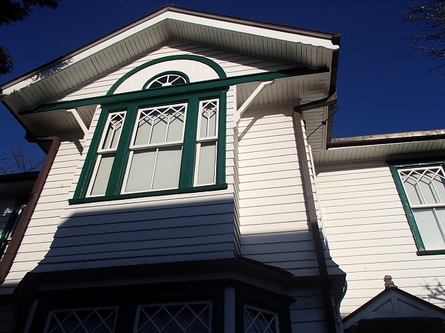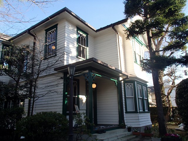 「旧マッケーレブ邸」です。日曜学校を開いたりしながら宣教活動をした場所なんですね。太平洋戦争でアメリカに戻ってしまったそうですが、真ん中に煙突があって、その周りに暖炉があったり、日当たりのいいベンチがあったり、外からのこの窓がかっこよかったですね〜。我孫子にもいろいろ屋敷があるので、こんな感じで保存してかっこよく見せると観光地としてもっと魅力がでそうな気がしますね。