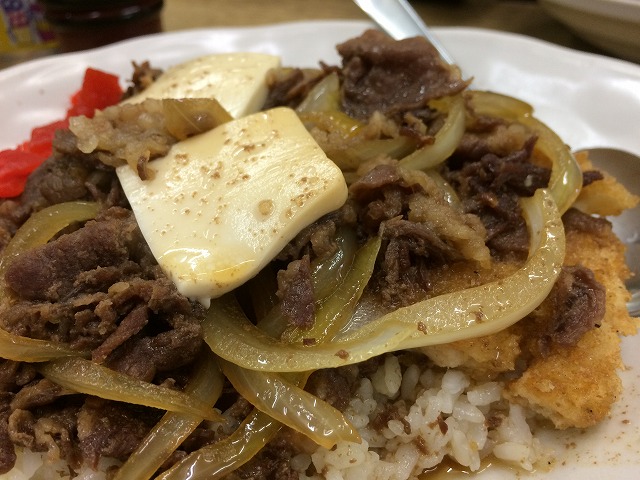 カツ丼でもない牛丼でもないすき焼き丼でもない、、、食べてみるとあまーい牛丼にカツが入った感じでめちゃくちゃ美味しいです!平たく切った紅しょうががアクセントになってペロッと食べてしまいました。みてください、この嬉しそうに食べる東葛人さん!