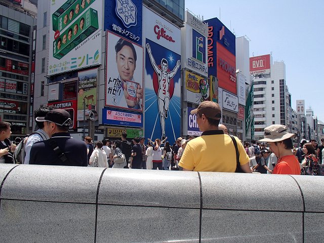 二日目の午後のテーマはまたもや「食い倒れ」。関西うどん食べようという事で道頓堀までいきました。まずは定番のグリコですね〜。相変わらず人だらけですが、やっぱり外国人だらけですね〜