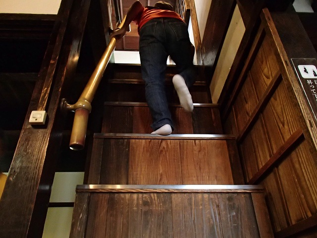 二階には学生と女中さんが暮らしていたようですが、この急階段は上り下りが大変ですね。昔の人は足が小さかったのでしょうか?僕は半分しか階段に乗れません。