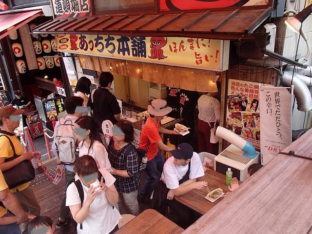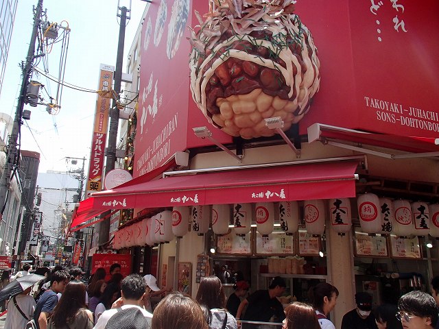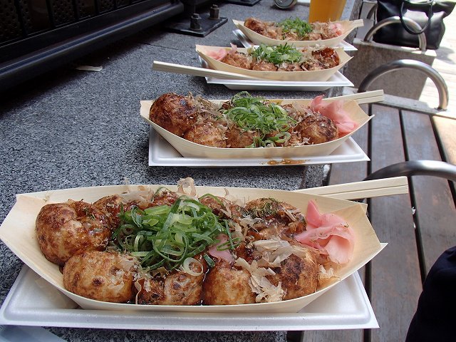 お次は、やっぱりこれですね〜。あっちこっちにお店があって大行列だらけ、、、このあたりならどこで食べても美味しいので、大行列はパスして「あっちち本舗」さんでたこ焼きとビールを購入!やっぱり美味しいですね〜。お箸を渡されたのと、ガリが乗っていたのにちょっと驚きでした。各店舗で特色を出そうとしているんですかね〜。