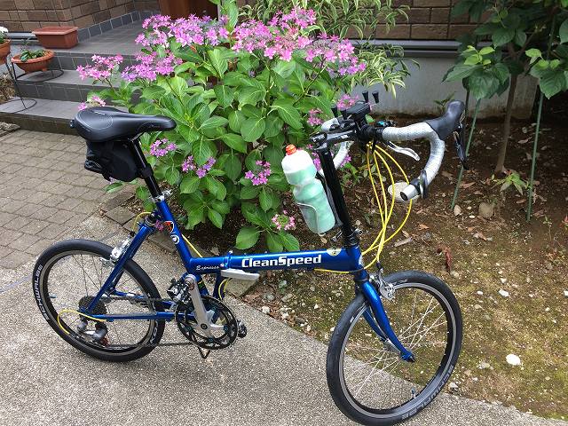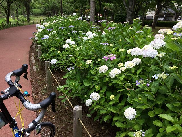 「あじさい通り」に到着前に小休止です。いつもの公園ですが、全然、蚊がいなくて快適でした。このタイヤ(シャワルベ KOJAK)は乗り心地やわらかいけど、転がり抵抗も少なくていいですね。10年前のタイヤと比べちゃいけないんですけど。いいタイヤです。