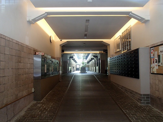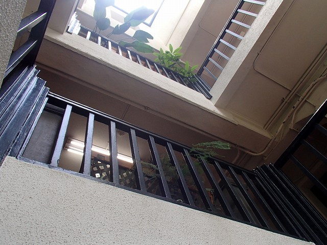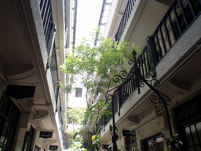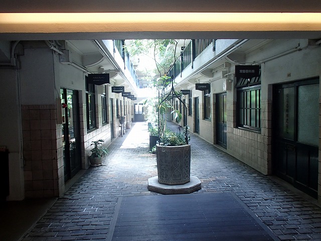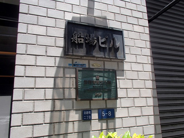 ここは「船場ビル」で、ここも雑居ビルです。昔はトラックが中まで入ったらしく入り口がでっかいスロープになってました。中はこんな感じでめちゃくちゃ格好いいです。最初は自動扉が反応しなかったので入れないのかと思いましたが、リトライしたら開きました。中庭とかあってカッコイイですね。