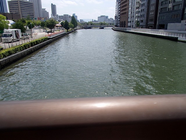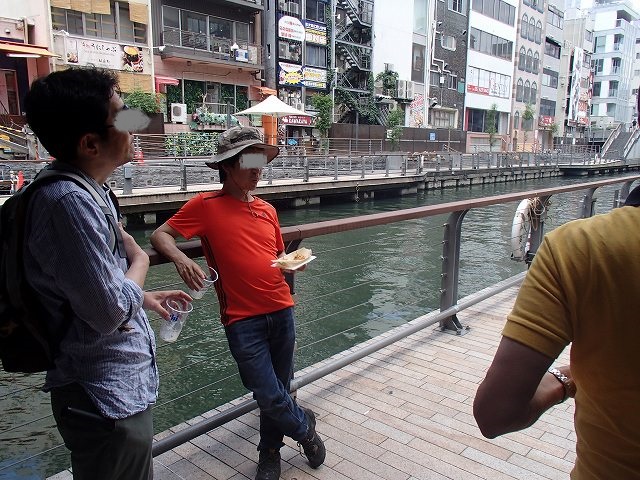 道頓堀の両岸は整備されてベンチがあるので、日陰に入ってたこ焼きとビールを堪能しました!!さすがにお腹いっぱいになってしまった、、、という事で少し移動して歩きます。