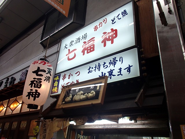 「食い倒れ」を締めるはずだったのですが、「もういっぱいだけ呑もう」という事で「天神町筋商店街」まで移動して呑みなおしです。人がいっぱいで、どのお店も入れませんが、カウンターに空き席を見つけて交渉したのは「串カツ、土手焼き、の七福神」さん。