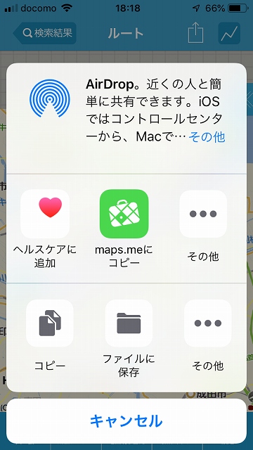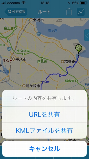 検索するとこんな感じでルートが表示されます。このルートを選択したら□しろいしかくに↑のマークで「KMLファイルを共有」を選択し、MAPPSMEにコピーを実行するとリストに追加されます。