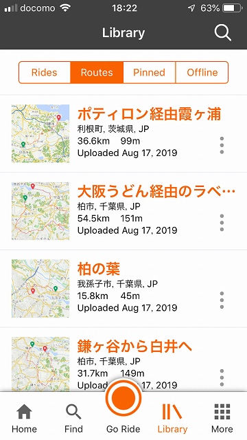 先ほどRidewithGPSにインポートしたルートがスマホではどう見えるのかな?と思って、スマホにもRidewithGPSアプリをインストールして確認すると、LibraryのRoutesにリストが日本語で表示されるので見やすいですね。