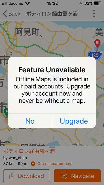 このルートをナビゲーションしようかと思ったらUpgradeと表示されてしまいました、有料契約じゃないとナビゲーションはできないんですね〜。