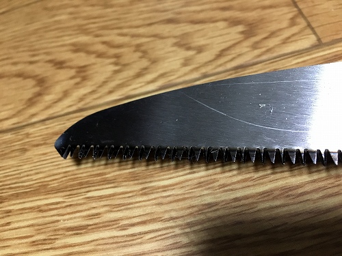 ノコギリはDAISOで300円でしたが、しっかり薪を切断することができました。中学校で習った呼び方で横挽き歯っていうんですよね〜。縦挽き歯の方が切れると思ってたんですけど、名前の通り木の繊維に対して横に切断するので、横挽きでいいんですね!