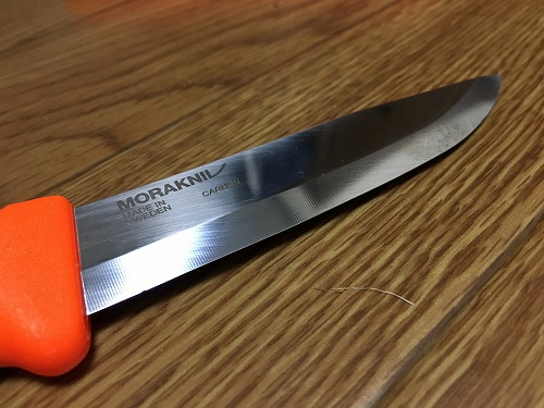 ナイフはモーラナイフ コンパニオン ヘビーデューティ(オレンジ)です。歯厚が3ミリ以上欲しかったので3.2ミリのカーボンスチールのタイプにしました。ちょっと錆びやすいので手入れが必要らしいです。ま、これも手間を楽しみましょう。
