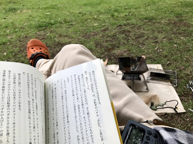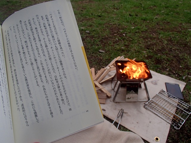火を起こして焚火に当たりながら読書します。もう6月だけど寒いなんて〜。