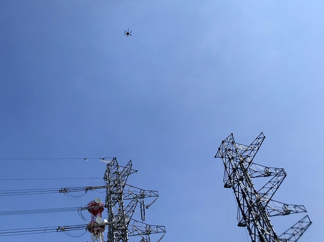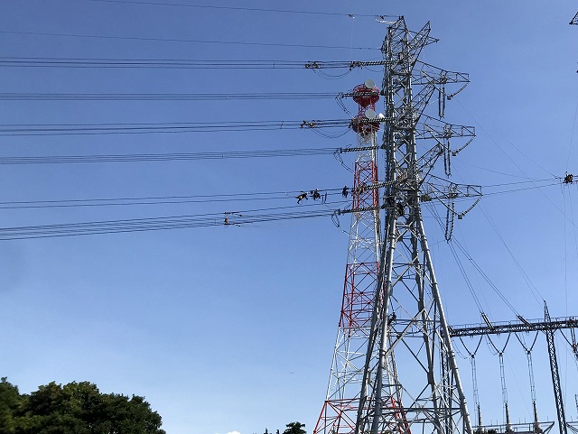 花見川CRではドローンが飛んでます。。あれ?禁止じゃないの?と後ろを見ると高圧線に人がいっぱいぶら下がってめちゃくちゃ素早く動き回ってます。高圧線の保守作業の記録をドローンでやってるんですね。