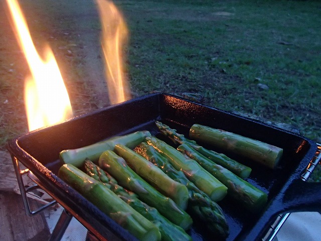 調理器具はスキレットです。スキレットの温度がわからないので、オイルを引いてアスパラ焼いて確認します。穂先はすぐに焼けて美味しい!