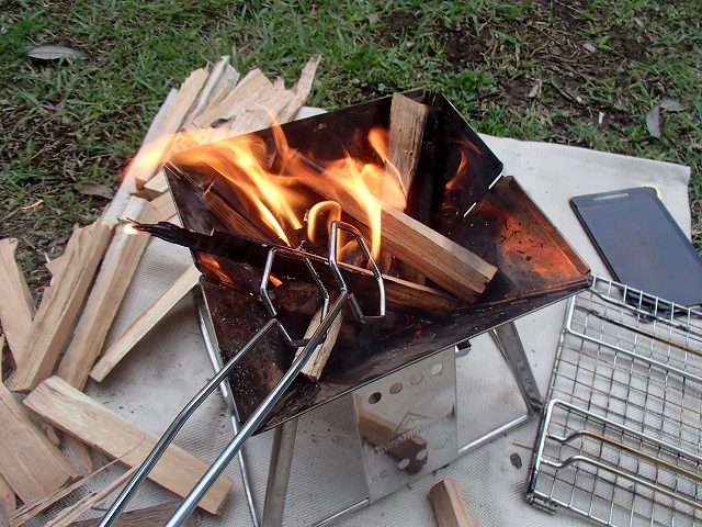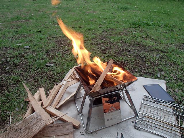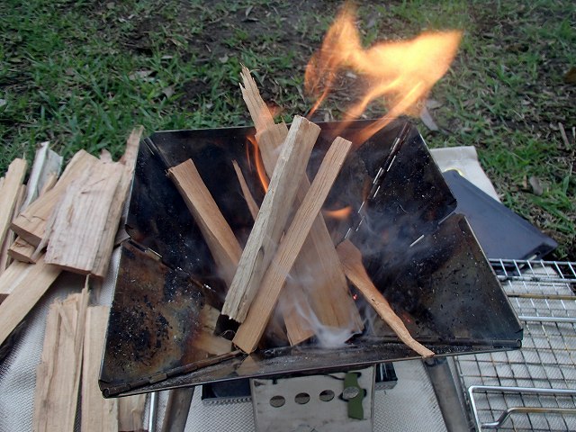 ビックリして「削りくずに油を染み込ませたもの」と「一番細い薪」を入れた焚火台に放り込んだら一気に燃え上ってくれました。ライターと着火剤使った方が火が付かなかった気がする、、、気の性かな?あとは少し太めの薪を上に組んでいけば出来上がり!