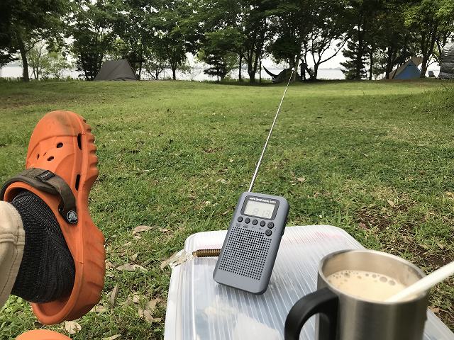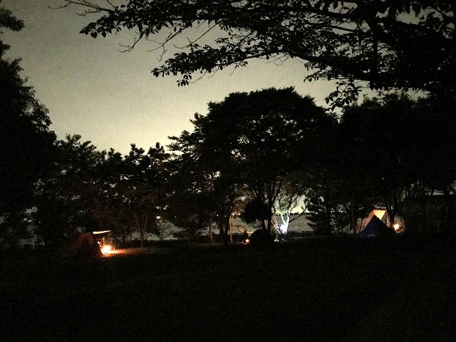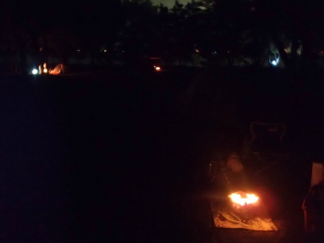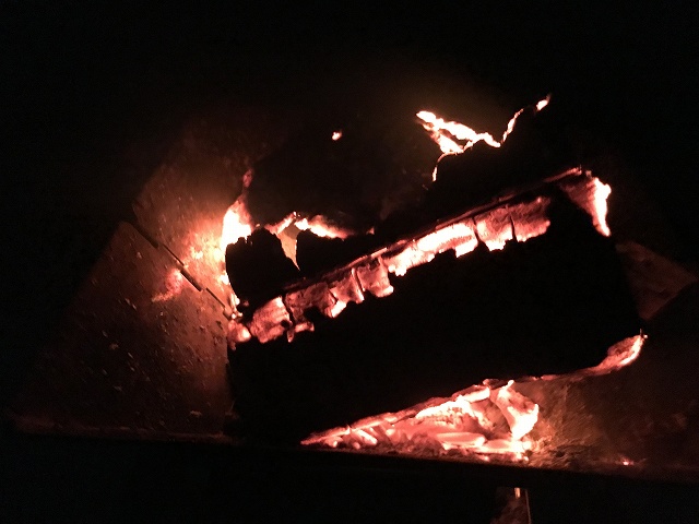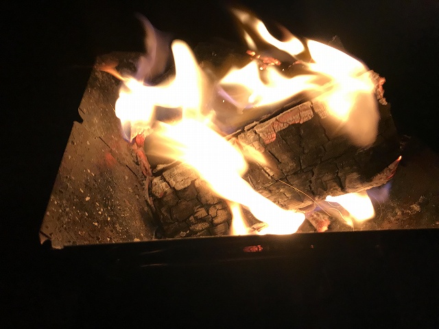 焚火を眺めながらのんびりと過ごす夜です。これをやりに来たんですよね〜。ラジオを自分だけ聞こえるボリュームで聞きながら火が落ちないように少しづつ薪をくべるのが楽しいですね。風があるので火吹き棒を使うことがありませんでした。
