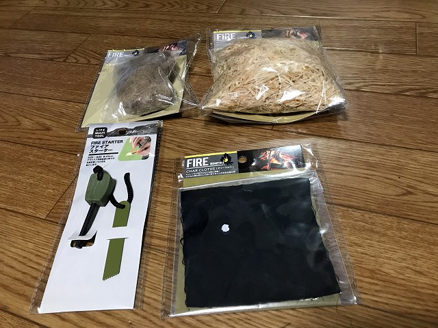 これが「火起こしセット」です。右上から時計回りに「削りくずに油を染み込ませたもの」、「チャークロス」、「ファイヤースターター」、「麻紐を解いたもの」、です。マニアな人は自分で作るらしいけど、セリアに合計440円で売ってるのであればこれでいいや(笑)