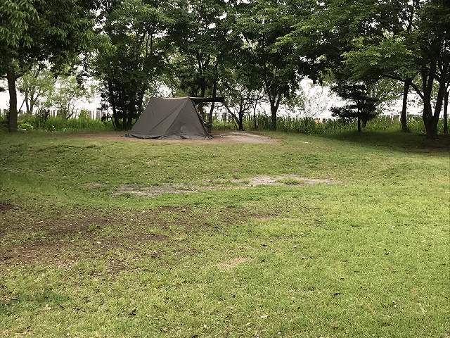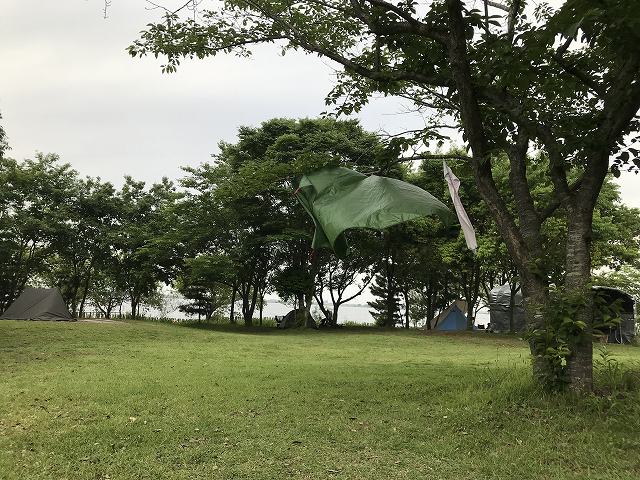 ひろい芝生のフリーサイトです(元ゴルフコース、、最近このパターン増えてるみたいですね)。先客のテントからの距離を考えて、このあたりに決定!(一人だったらグリーンの上にテント張ったかな〜)