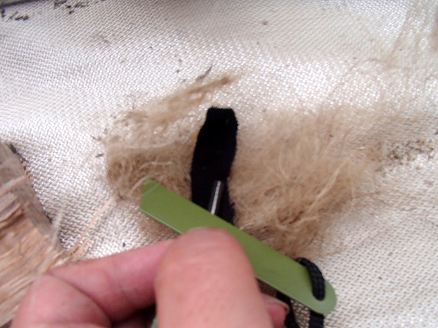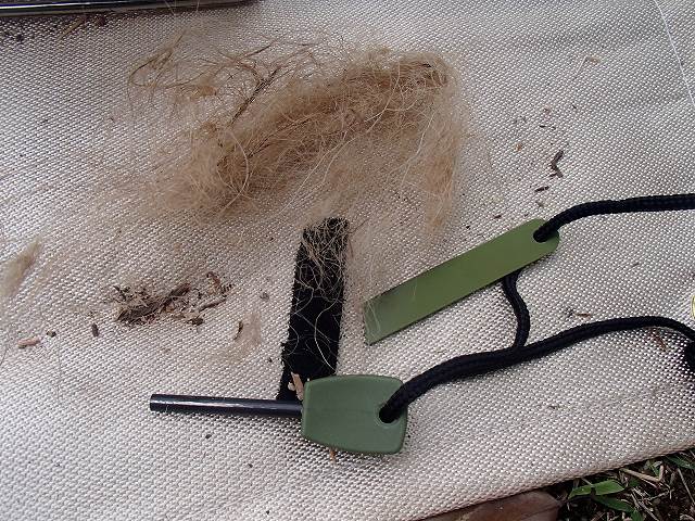 「麻紐を解いたもの」に「チャークロス」をのせて、「チャークロス」の上で「ファイヤースターター」の棒を付属の鉄板で勢いよくこすると、火花が「チャークロス」に点々と付着しました。