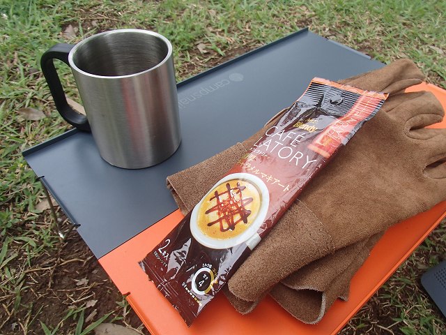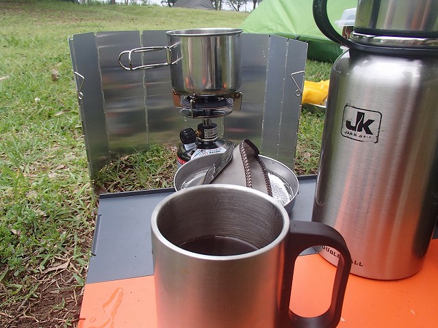 焚火の灰は朝一番にかたずけて、バーナーで湯沸かしして、ドリップコーヒー!
