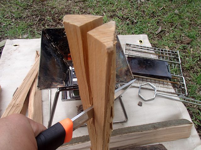 左上の薪を縦に4分の1にしたものです。この後、「火起こし」用にさらに4分の1にします。