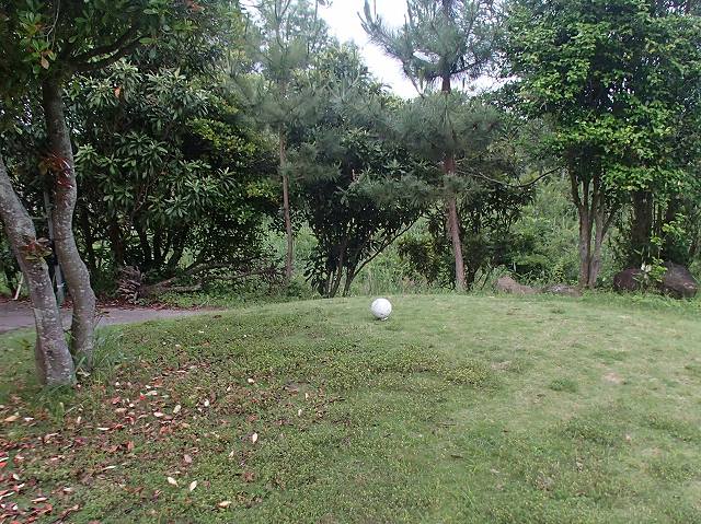 ここがティーグラウンドですね。ちゃんとでっかいゴルフボールがある(笑)