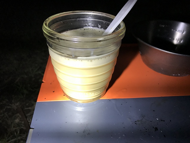 消灯10時なので、30分くらい前には熾火にして、薪をくべませんが、チタンシェラカップに水を入れて直火で湯を沸かしてキャラメルマキアートで暖まります。