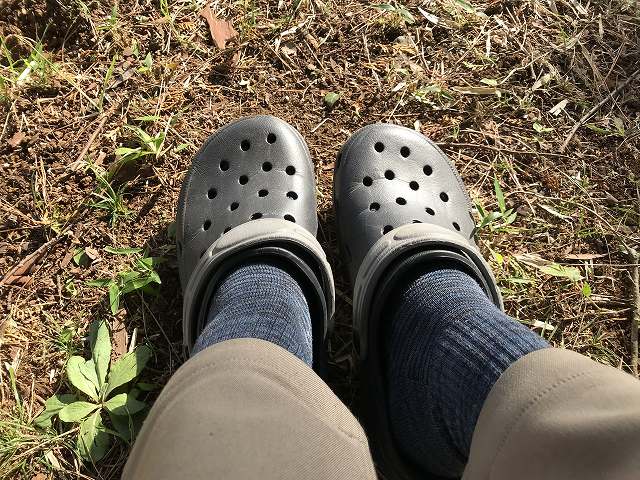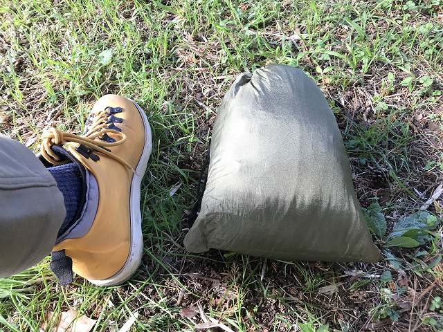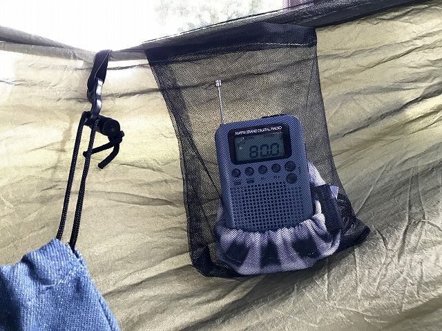 高さもいい感じになったので、室内の袋にラジオいれたり本を持ち込んだりして好きなように調整します。ブーツだと乗り降りが大変なのでクロックスもどきに履き替えて、のんびりする準備が完了!クッションの1つは枕替わりにするためでしたが、これ正解!頭が安定してくれます。