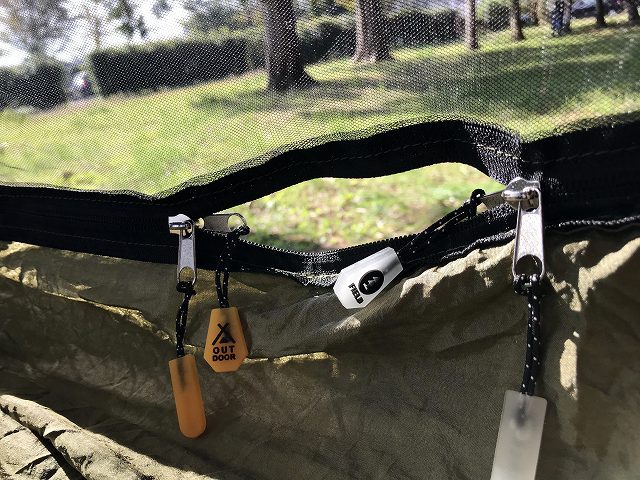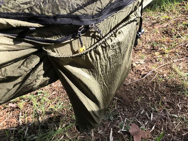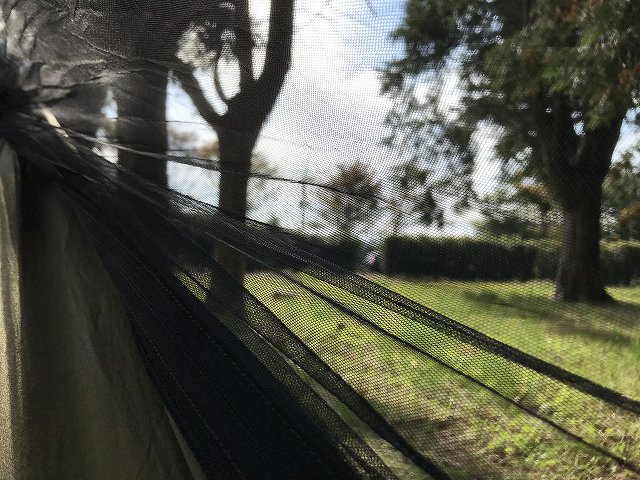 そしてハンモックについているカラビナを、ハンモックストラップのデイジーチェーン(輪っかがいっぱいあるロープ)の適当なところに取り付けます。蚊帳はハンモックにくっついていて、ゴムひもを渡してあるので垂れ下がって来ません。ガイロープで後ろの木に固定しておくとひっくり返ることもないでしょう(笑)