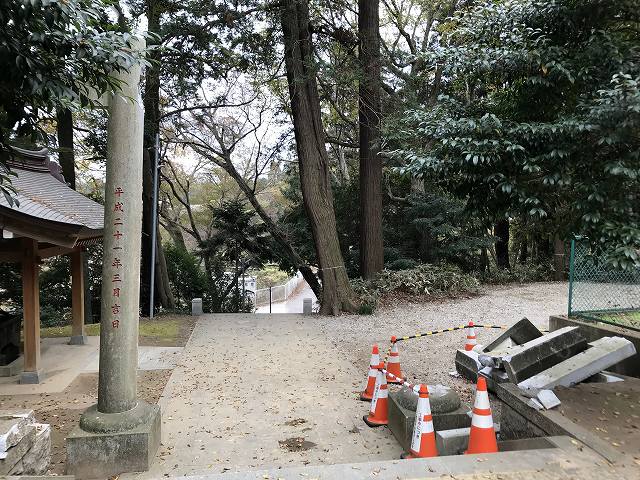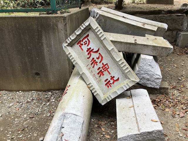 山を下りてくるときに違和感があったんですが、違和感の原因はこれでした。なんと鳥居が崩壊してます。見るからに最近崩れたようなのですが、どうやら倒木の直撃を受けたらしいですね。自転車停めたところに、新しい切り株があったんだけど、これ??樹齢数えたら80年くらいだった気がします。7月には神楽があったり、初詣は大混雑したりするようなので、人の多い時に崩れたのではないのでしょうね。