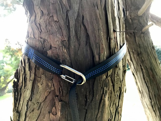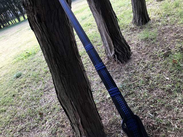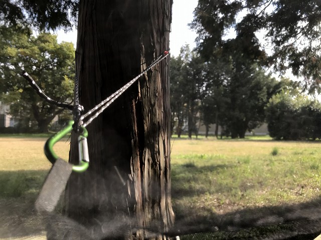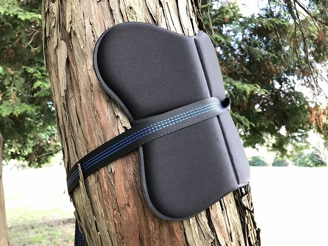 太い木の幹(ここは太いのしかないので細いの探した、、)にハンモックストラップを巻いてクッションを木の間に挟んでおきます。(ストラップがねじれてたのはこの後直した)カラビナにしてあるので簡単に取り付けできますね。