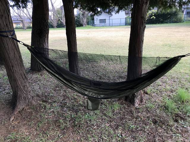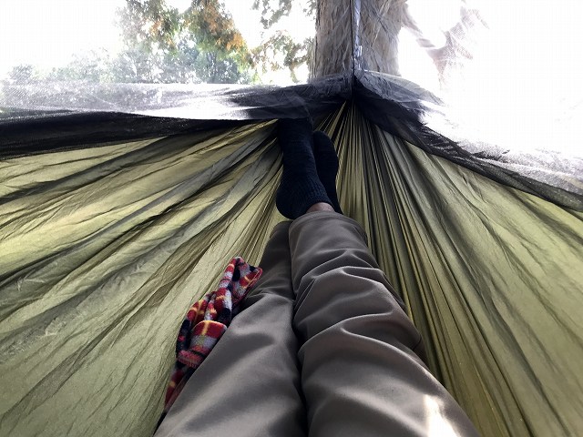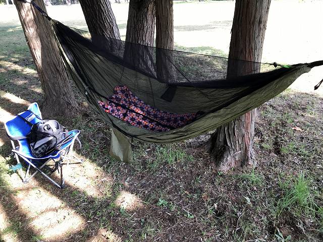 いつもチェアリングに使っているのはコールマンのローチェアですが、形が普通のチェアなので長く座っていると腰が痛くなるのですが、ハンモックは腰への負担はゼロでした。