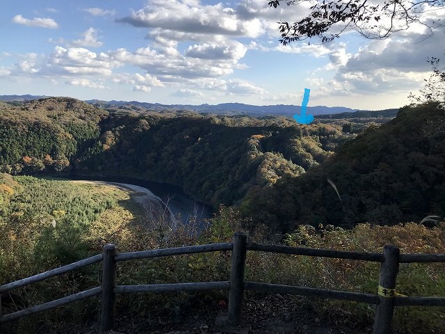 あそこに見える(青い矢印の先)のはキャンプ場です。肉眼ではテントと人が見えました。いい場所にキャンプ場がありますね〜。「鎌倉山の雲海」が有名なのでキャンプ場の朝はすごい雲海が見られるかも??雲海の中かも??この日、輪友のたすけさんが那珂川沿いの鮎を求めて「大瀬のやな」にも来ていたらしくもしかしたら見えてたかも(笑)
