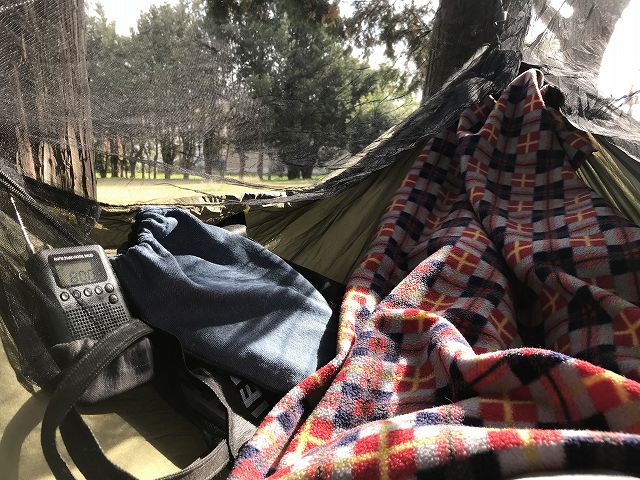 こういう時にデイジーチェーンはいいんですよね〜。実はタープと同じKOBEブランドのハンモックがあったんですが、、デイジーチェーンじゃなかったので、これにしました。何度かカラビナを付ける場所を調整して長さを変更して完成!ちょっと寒いのでブランケットを2枚(敷と掛)つかって寒さ対策もしておきます。
