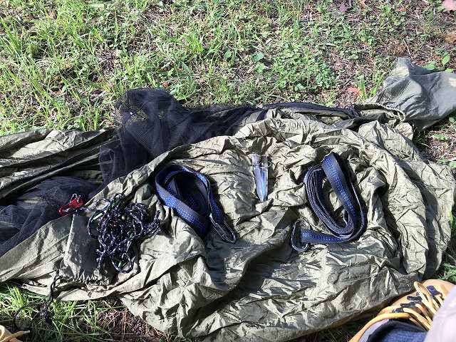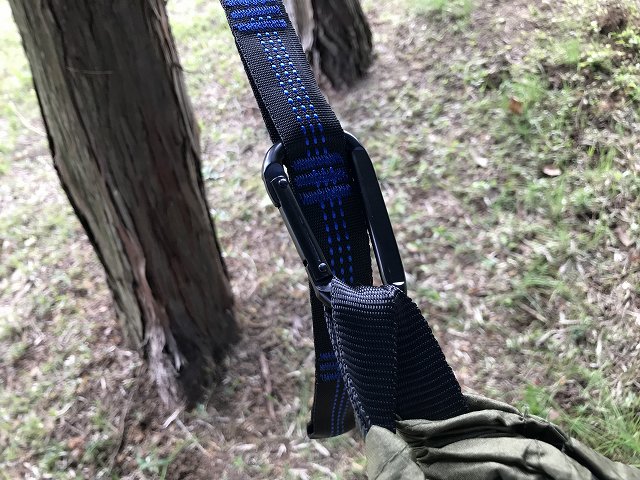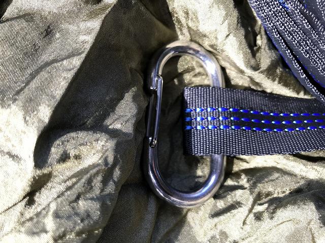 中身はこんな感じで、ハンモック本体とガイロープとペグとハンモックストラップがセットになってます。ペグはSERIAの軽くて短いやつに交換してあります。ハンモックストラップは木に結ぶか輪っかに通すのですが、結ぶ技術がないのでカラビナをつけてあります。このカラビナは耐荷重30キロでハンモックの両側につくので60キロまでは耐えられますね。