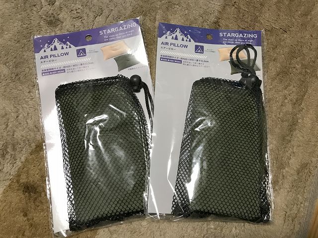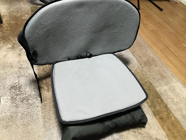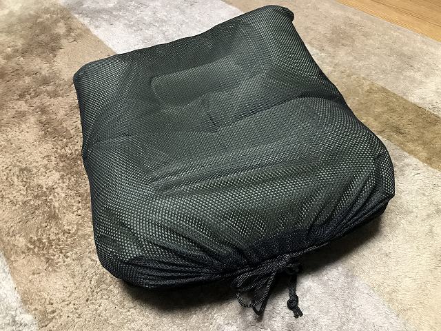 代用品はエアピローとネット状の袋です。結構しっかりしているので2つ購入して、ネット状の袋に入れる事で、いい感じの座布団になってくれました。半日くらい座ってみたけどエア漏れも許容範囲なので使えそうです。