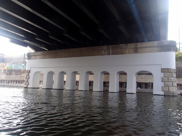 東京の水路は橋がクロスでオシャレだったり、橋げたがこんな感じで船から見る事が前提だったりします。護岸もあちこち整備中で公園になるみたいですね。